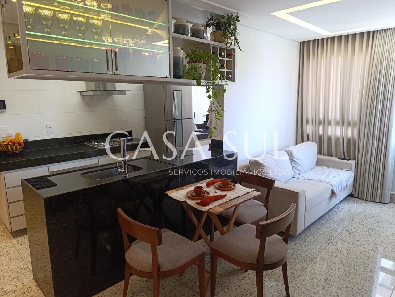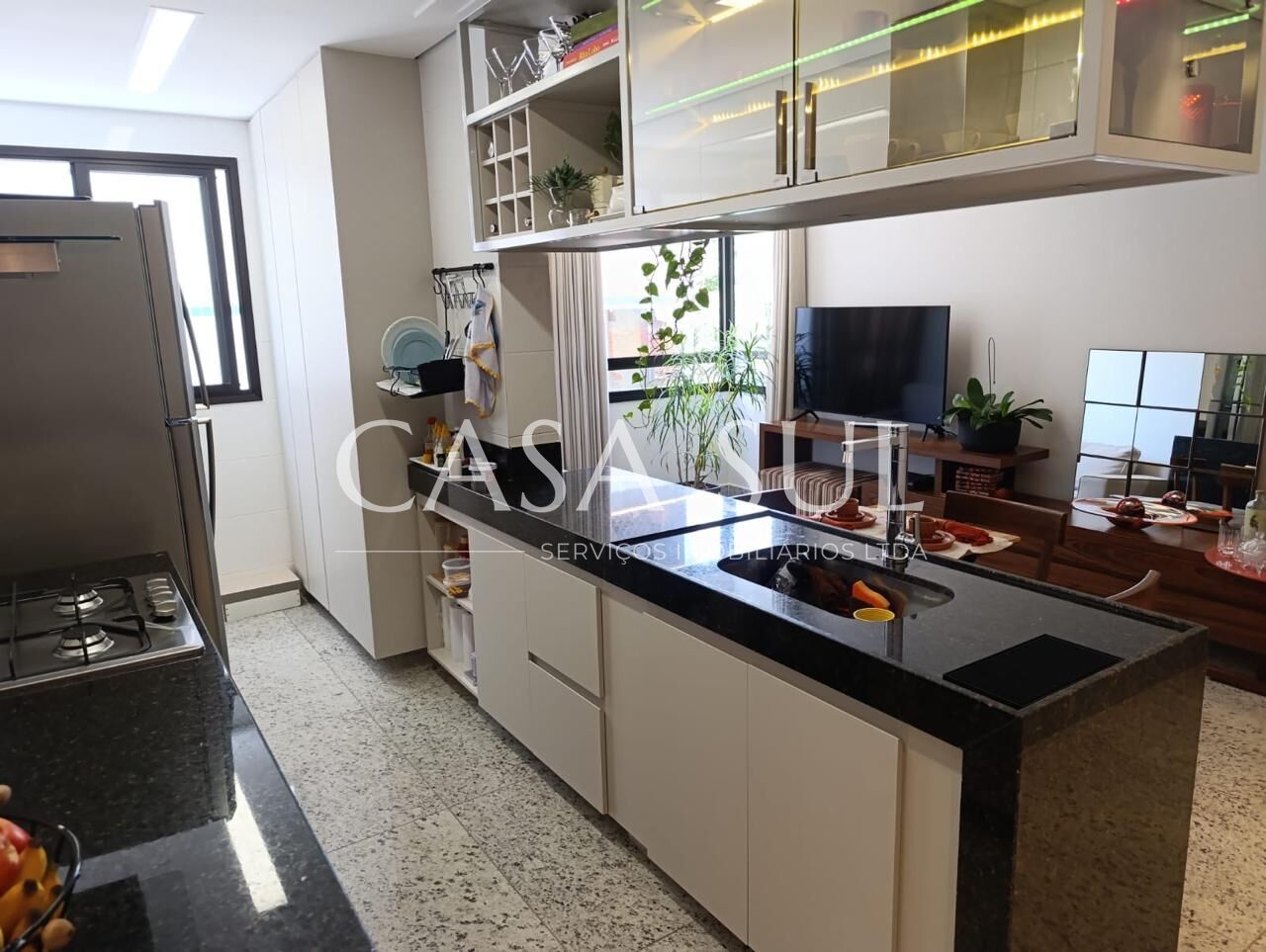 -Cozinha americana com bancadas em granito, e montada com armários.