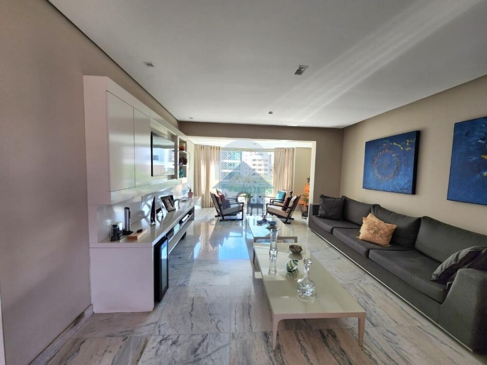 APARTAMENTO: Muito bem conservado, claro e arejado, salão para 3 ambientes amplos, varanda integrada na sala, lavabo, piso em mármore branco, painel de TV, são 04 quartos com armários, sendo 02 suítes, a máster com banheira de hidromassagem, banho social, (todos os banhos com armários, box e espelhos), piso dos quartos em tábua corrida, pisos das partes frias em granito, cozinha com armários, área de serviço, despensa, quarto e banho de serviço. 03 vagas de garagem, possui box de despejo.