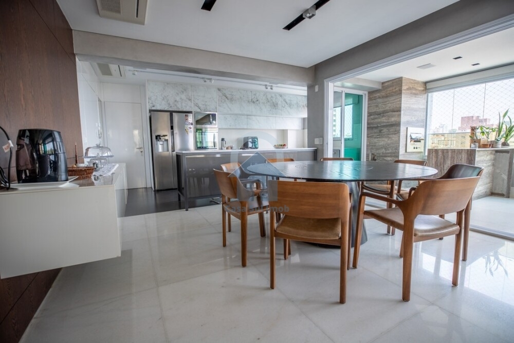 APARTAMENTO: Claro e arejado, bonita vista, salão para três ambientes amplos com varandão e lavabo, piso em mármore branco polido, cozinha ampla com armários L’Idea, com piso em silestone, integrada com a sala, varandão, são 04 quartos todos com armários, sendo duas suítes e duas semi suítes, a máster com closet, pisos em laminado, todos os banheiros com armários, box, espelhos, com os pisos em mármore polido, área de serviço com armários, dependência completa para empregada. 04 vagas de garagem.