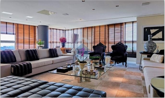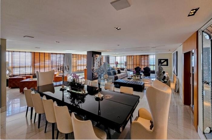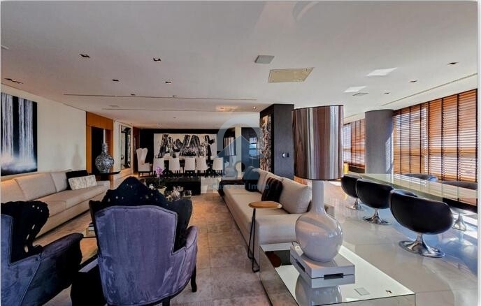 Apartamento : Salão para 3 ambientes com piso em mármore, rebaixamento de teto em gesso e projeto de iluminação (sala de jantar/estar/home theater). Escritório. Varanda integrada. Lavabo. Sala de almoço. Sala de estar intimo. 4 suítes com closet, suíte master com closet senhor e senhora, hidromassagem e varanda. Rouparia no corredor. Cozinha com armários, despensa, louçaria, lavanderia, dependência completa de empregada com 2 quartos de empregada. 5 vagas de garagem cobertas e demarcadas.