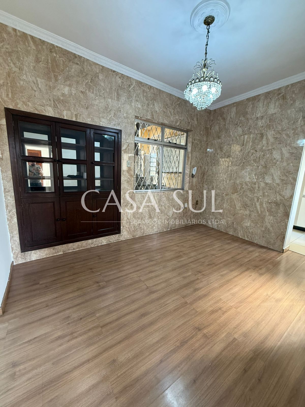 Sala de jantar com cristaleira, sanca de gesso no teto e piso em laminado;