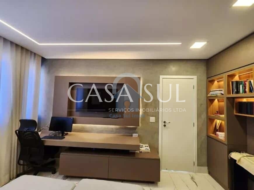 APARTAMENTO: 1º NÍVEL: Sala para dois ambientes amplos com piso em porcelanato, painel de TV, teto rebaixado com projeto de iluminação, 03 quartos sendo 01 suíte, todos com armários de excelente padrão, piso da parte íntima em laminado de madeira, suíte do casal com painel de TV, espaço home office, banhos com armários, box e espelhos, ampla cozinha com excelente marcenaria, bancadas em granito, área de serviço, despensa, banho de empregada.